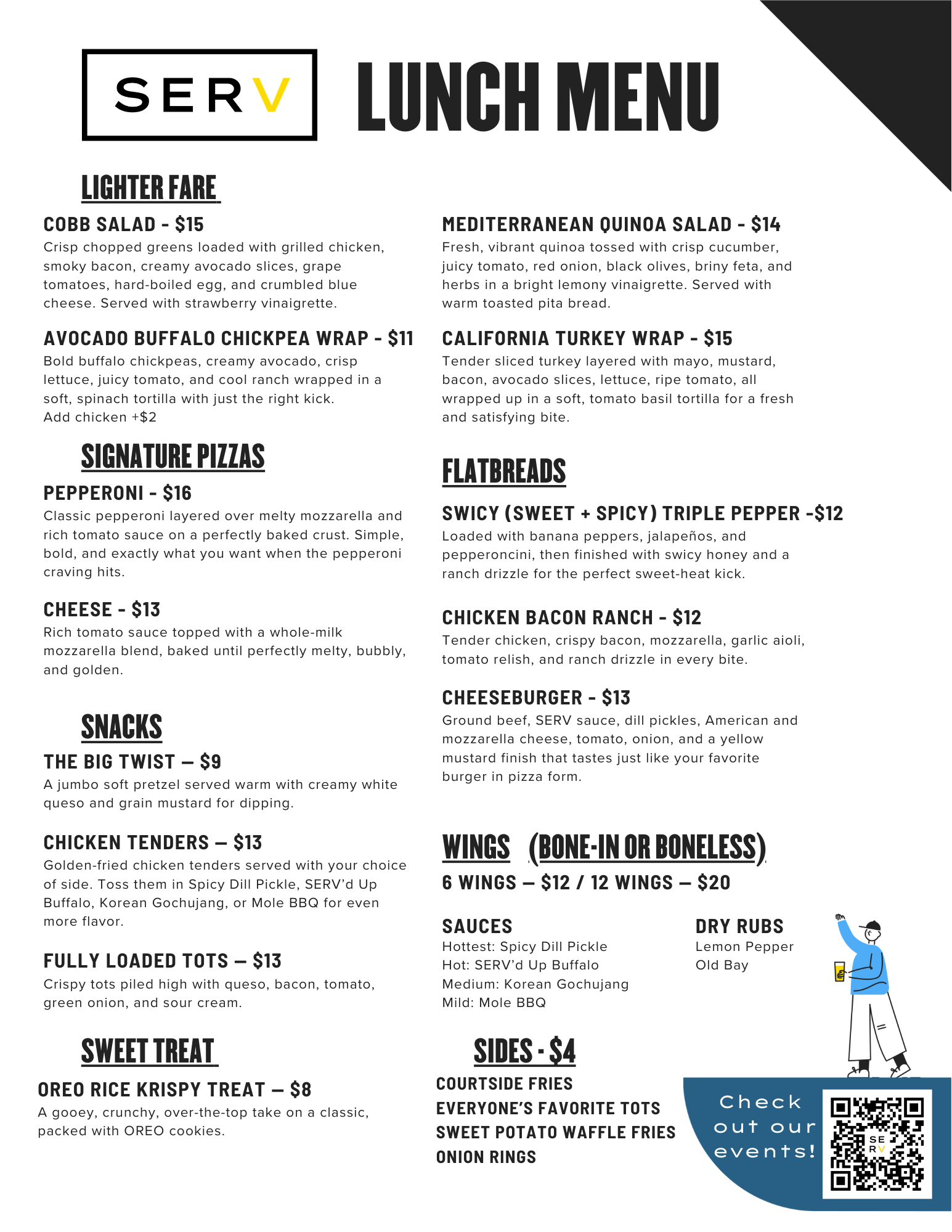 Happy Hour at SERV isn’t just a deal—it’s a whole vibe. Swing through, grab a drink, and let the cravings take over with shareables, sliders, and personal pizzas that hit every time.